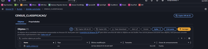 The Oracle Database is connected to the Data Lake where the buckets were created. Within the datalake-autorizador bucket, the folder CENSUS_CLASSIFICACAO is created, where the apoio_census.csv file is uploaded.