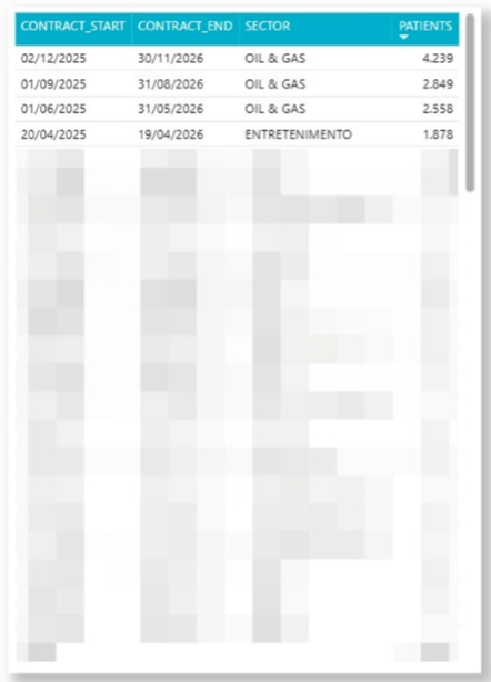 By creating a view from the query above, it is possible to connect the data to Power BI via ODBC and build visuals that are already normalized and enriched. For data privacy reasons, we will only present the central table extracted from the Power BI dashboard.